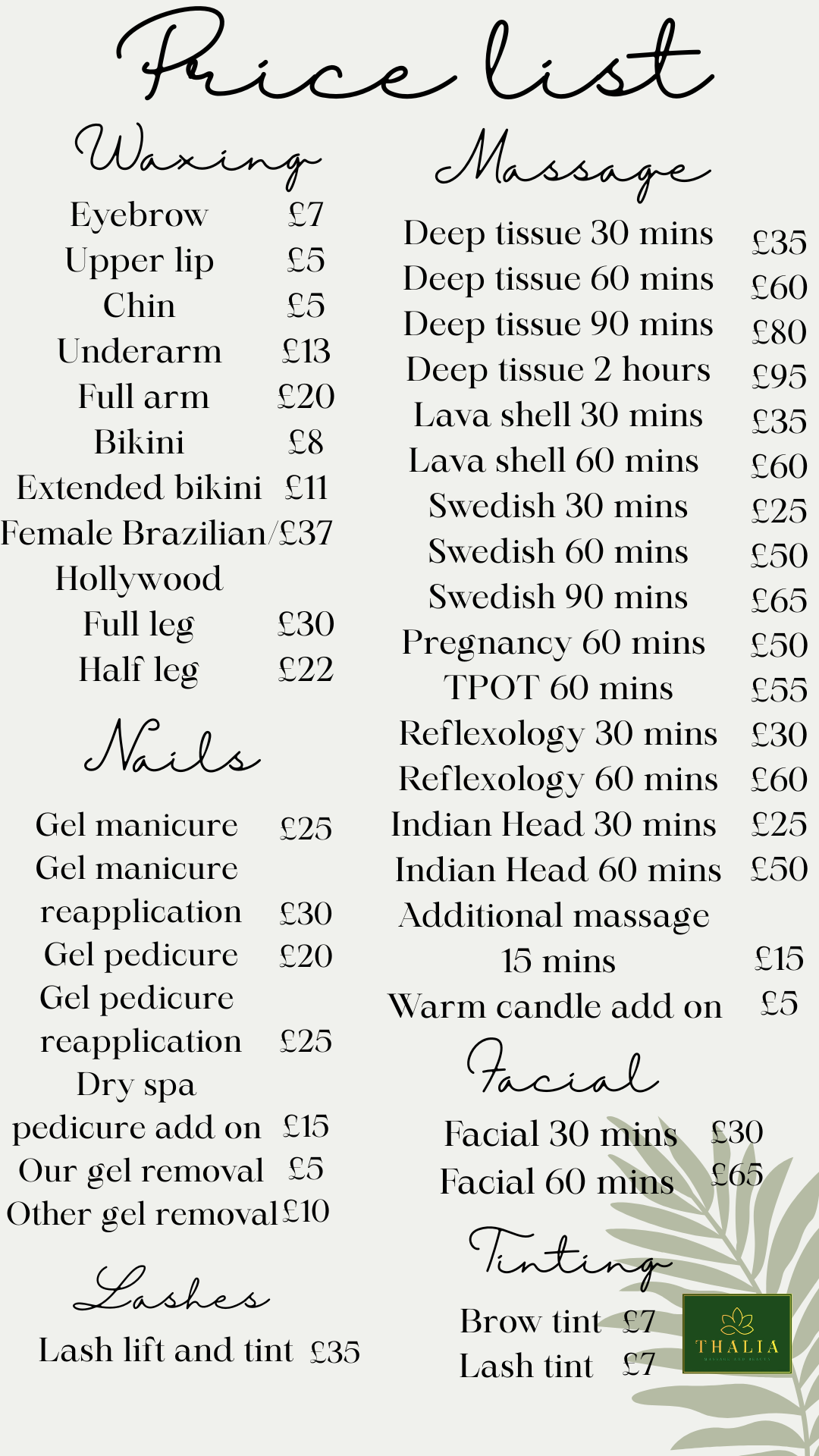 Here at Thalia we offer a wide range of massages to suit everyones needs. From Swedish massage/hot stone massage/pregnancy massage/reflexology and Indian Head Massage to help you to completely unwind and relax, to deep tissue massage, focusing on specific areas of concern, break down any deeper tension and/or knots and release stress on the body. Thai massage increases mobility and flexibility through stretching and palm pressing techniques. enquire to find out what massage would work best for you. With the choice of a 30/60/90/120 minute bespoke massage.